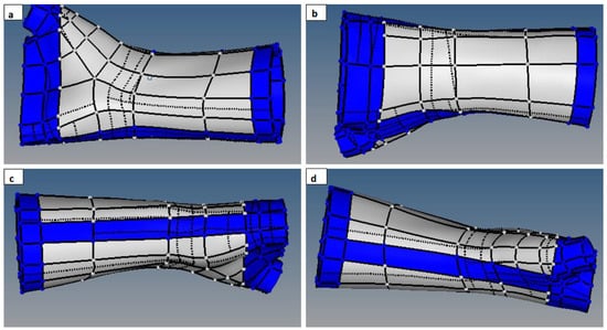 The “fixed” areas are depicted in blue, whereas the “free” areas are shown in white. Views: (a) palmar view, (b) dorsal view, (c) view from the ulnar side, (d) view from the radial side.