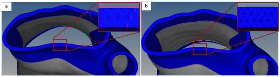 (a) Coarse mesh with 1.5 mm element size and (b) fine mesh with 1.0 mm element size applied to the case of wrist deviation and flexion.