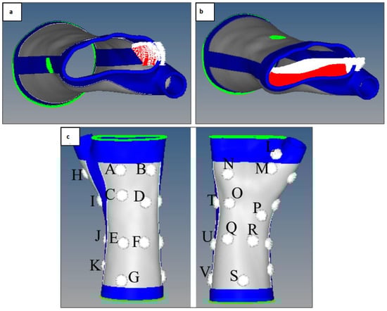The forces applied by the hand–wrist to the splint were quantified using specialized pressure sensors, each with a thickness of 0.20 mm, as detailed by []. These sensors measured forces at 22 distinct points on the splint. The force magnitudes at each of these 22 points are summarized in Table 2. It is essential to note that these forces were applied perpendicular to the relevant surfaces of the FE model, as illustrated in Figure 7c. This method ensures that the simulated loading conditions closely reflect the actual forces experienced by the splint, enhancing the accuracy of the model.