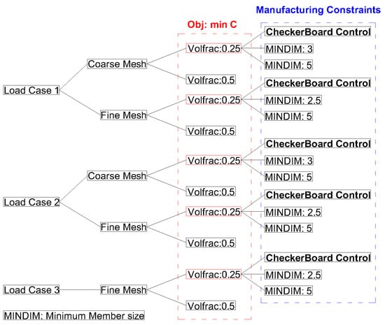 It is important to mention that applying the MINDIM constraint automatically activates the CHECKER parameter, while additionally increasing the value of the  parameter from 1 to 2. The  parameter essentially represents the penalty factor p, mentioned in Section 2, used to penalize the intermediate density elements in each design, in order to produce more distinct solutions, which are easy to manufacture. The DISCRETE parameter in Optistruct is related to the penalty factor, p, as follows: . Therefore, in the case where the DISCRETE parameter takes the value 2, when the MINDIM constraint is applied, this means that , which is a typical value of the penalty factor for solids.