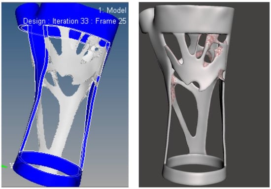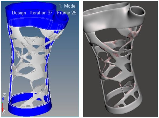 Printing the original non-optimized model of the wrist brace was deemed necessary mainly to avoid errors and to verify that the final geometry of the splint is fully compatible with the anatomy of the hand, before moving forward to address the TO problem based on the specific design. To create the initial design/prototype of the brace (not optimized), the Dimension Elite printer (Stratasys, Eden Prairie, MN, USA) was used, using ABS P430 (Acrylonitrile Butadiene Styrene) thermoplastic filament to create the main structure and soluble filament P400SR for the construction of the supporting structures (supports). These structures are the result of printing extra material on top of this basic model to hold the deposited material of the main structure in place, especially in areas of high geometric complexity, as it is initially in a semi-liquid state until it cools down and solidifies completely. The prototype of the original non-optimized wrist brace design created through the use of the FDM 3D printer presented a full fit to the patient’s hand while allowing finger movement to perform daily activities. Offsetting the initial scanned surface of the hand anatomy outward by 1 mm, in the design development stage, played a very important role in achieving a comfortable and at the same time stable brace model for complete immobilization of the necessary parts of the hand and freedom of movement of some others. As this model was considered quite good in terms of comfort and application, the solution to the TO problem was based on this specific wrist splint design (Figure 15).