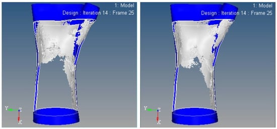 The software used for the TO iterations is HyperWorks. In Figure 8 are presented all the TO analyses that were completed in this research. The results obtained from solving each TO problem are then processed in HyperView. In each optimized wrist brace, design elements are generated that have a relative density of . A way to visualize, understand and compare the results is to choose to display the elements that have a relative density value above some threshold. In this study, the value of the relative density that has been chosen as a limit is . This means that all elements presented in the design section (depicted in gray in Figure 9 and Figure 10) of the topologically optimized wrist splints have a relative density value greater than or equal to  to 1 (). All elements with density less than  have been removed in the post-processing stage in HyperView.