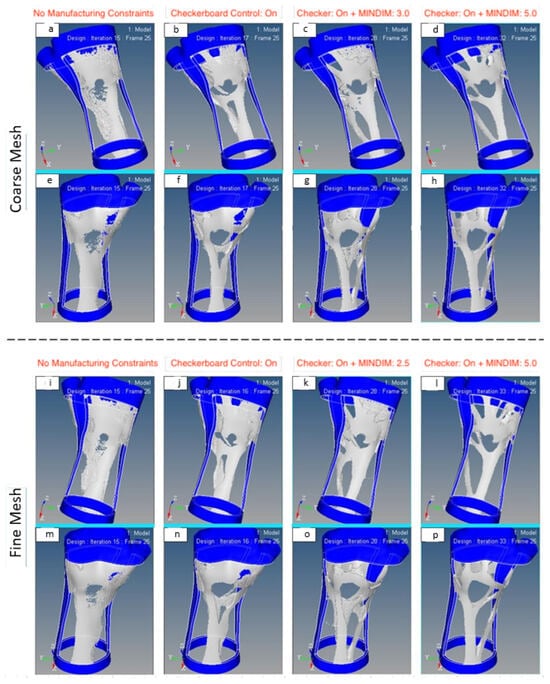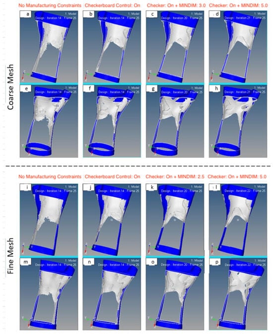 Load Case 2. Volfrac 25%. Comparison of results of not using as well as applying the CHECKER and MINDIM parameters to the splint models with (a–h) the coarse and (i–p) the fine FE mesh.