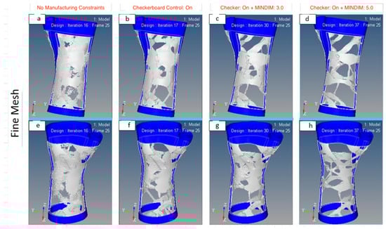 Load Case 3. Volfrac 25%. Comparison of results of not using as well as applying the CHECKER and MINDIM parameters to the splint models with (a–h) the fine FE mesh.