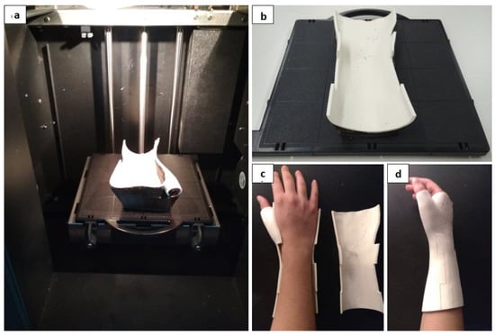 Fusion Deposition Modeling of the original non-optimized wrist brace design using the Stratasys Dimension Elite 3D printer. (a) Lower and (b) upper subpart of the splint, (c,d) complete and comfortable fit of the wrist brace prototype on the patient’s hand.