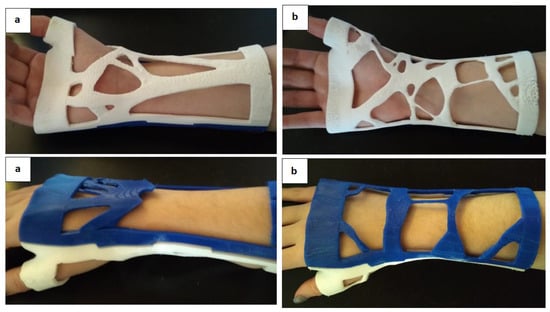 It is noted that of the three load cases studied in this work, two models were constructed, based on Figure 13l,p and Figure 14d,h: (a) wrist flexion brace and (b) 22 point force brace (Figure 16). In the fabrication of the two optimized wrist braces, the Creator 3 3D printer (Flashforge, Hangzhou, China) [] was utilized, using ABS filament and HIPS (High-Impact Polystyrene) as the soluble filament for constructing support structures. To simplify the printing process, each wrist brace was segmented into two sections. The printing duration for each brace was 22 h. The first 3D model was produced from the analysis that applied the second load case (wrist flexion) and utilized a fine mesh with a MINDIM setting of 5 (see Figure 9). The second 3D model was produced from the analysis that applied the third load case (22 point forces), with a fine mesh and the MINDIM parameter set to 5 (see Figure 10). Upon application, both braces match the anatomical structure of the patient’s hand, offering comfort and efficient air circulation to the arm [] (refer to Figure 16).