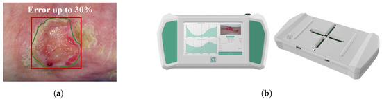 (a) The red outline describes a manual measurement of a generic wound, while the green outline describes the automatic segmentation performed by the device. The area of the rectangle and the area of the wound can have a difference of up to 30%. (b) A device for the acquisition, automatic segmentation, and area calculation of a skin lesion. Adapted from [7].
