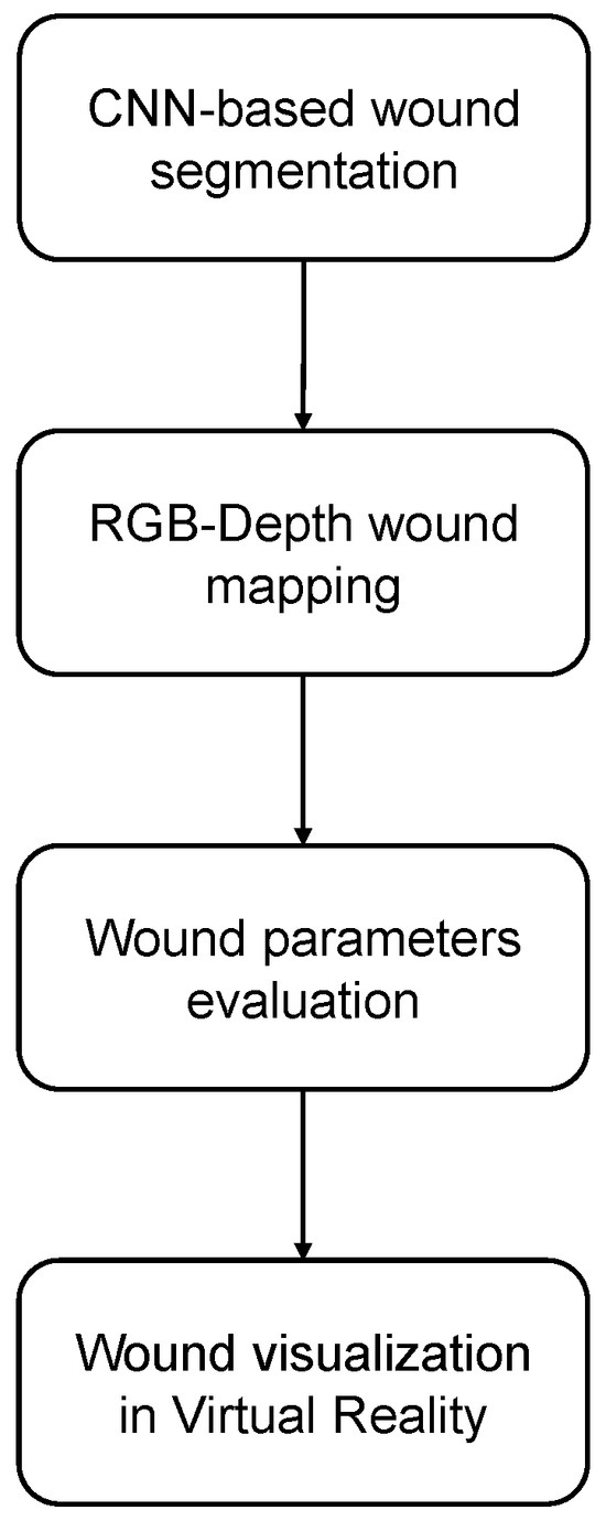 The remainder of this paper is structured as follows: Section 2 outlines the implementation of wound detection and segmentation using a CNN, parameter extraction from depth maps and 2D images, and the handling of 3D models within Unity3D. It also discusses the integration and functionality of the interactive graphical interface. Section 3 presents the obtained results. Section 4 discusses the results, addresses limitations, and suggests potential future implementations of the technology. Finally, Section 5 provides the conclusions.