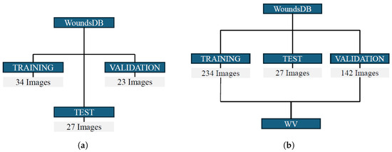 (a) Initial Dataset A split for network training and validation. (b) Updated Dataset B obtained by adding WV images for the training and fine-tuning of the network. In the Test Set, the initial images from WoundsDB, necessary for the subsequent purposes of this work, were maintained, while the Training Set and Validation Set were expanded.