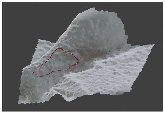 As shown, the 3D model of the ulcer is positioned centrally in the user’s FOV. This design choice was made to ensure that the potential of XR was aimed primarily at enhancing the presentation of the three-dimensional information while keeping the rest of the visual field as uncluttered as possible. This approach minimizes distractions that could negatively affect the user experience, a consideration that applies equally to virtual reality and augmented reality environments [31]. On the left side of the interface, the upper section displays the reference RGB image, which is used for automatic recognition based on artificial intelligence. The lower section includes a window that displays patient-related metadata, such as ID, gender, age, or medical record number. On the right side of the interface, the upper section presents a panel that allows users to adjust the properties of the 3D ulcer model, such as color and material, and access controls to calculate quantitative parameters, including the perimeter and area of the ulcer. The 3D contour outlining the ulcer’s perimeter was generated from the coordinates identified through the CNN-based segmentation and mapped onto the 3D surface (Figure 5). Specifically, Blender (version 4.1) was used to generate a polygon from the interpolated coordinates of the depth map (z) and the coordinates of the CNN segmentation (x, y).