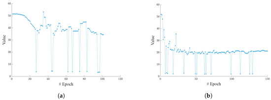 Figure 6 shows the trend in the segmentation loss function in both training sessions. In the case of Dataset A (Figure 6a), training was stopped at epoch 101 because no improvement in validation metrics had been observed in the last 30 epochs. For Dataset B (Figure 6b), the training continued until epoch 150, as there were slight improvements up to that threshold. However, the number of training epochs set to 150 was appropriate, as the loss function reached a plateau beyond which no further decrease was likely to occur.
