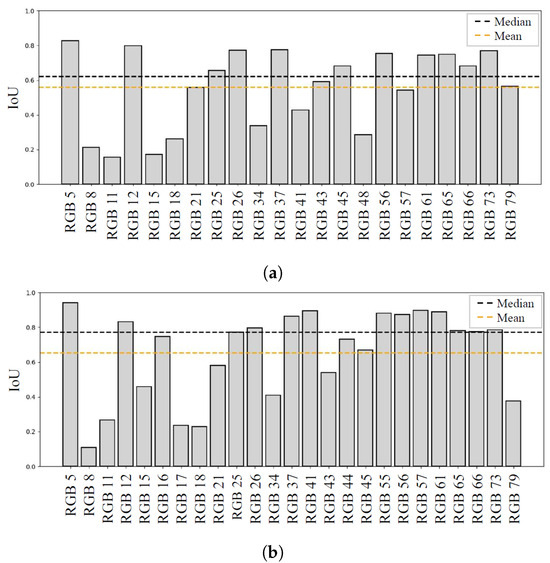 (a) Network trained on Dataset A. (b) Network trained on Dataset B. This figure shows YOLO segmentation performance (IoU) for each image. The median value is drawn in black, while the mean value is drawn in orange.