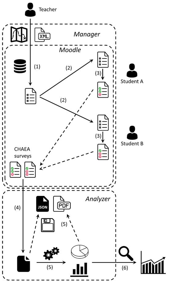 - Manager. This part of the system is equivalent to Moodle’s native modules “Question bank” and “Quiz”. It allows the teacher to create the CHAEA questionnaire, gather students to fulfill it, and then collect their responses for analysis.