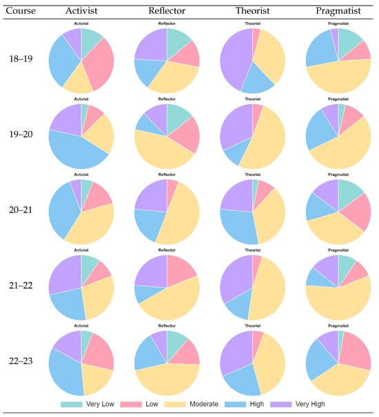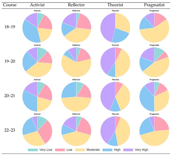 Another study [] along three consecutive academic years with two selected engineering subjects was performed with the same conclusions and a similar engagement. Moreover, although the group of the studied subjects was composed of different students each analyzed year, the predominant learning styles and their level scores obtained year by year for each subject did not reflect prominent variations. Additionally, courses from different branches of knowledge exhibited predominant learning styles that were different between them [].