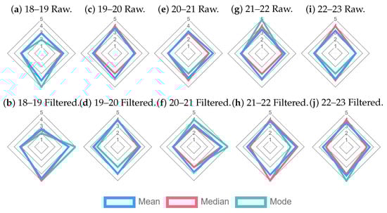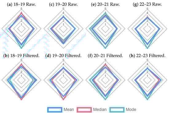 As previously mentioned, Figure 4 and Figure 5 exhibit the mean, the median, and the mode average profile of the course according to the learning styles score of each student. For each course, two scenarios were described: when all questions had been considered (raw, top row), and when applying the filtered questions methodology (filtered, bottom row) for the distinct academic years of this study. First of all, each subfigure shows a similar average profile for the mean, the median, and the mode functions, although it must be highlighted that the mode function provides more remarkable prominent learning styles, as can be observed with the theorist learning style (bottom grid line). Regarding the similarities between the academic years, the average profiles were alike, with a prominent theorist style. With respect to the subfigures Raw and Filtered for each academic year, the average profiles were related and did not present high differences (the shapes were similar).