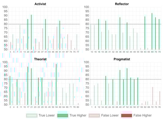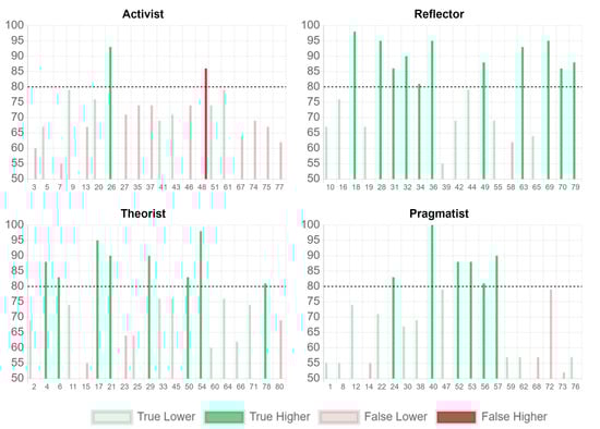 Another issue that must be noticed is that the levels (classes) of learning styles in the CHAEA are not balanced. Therefore, there are levels that are more susceptible to being downgraded or upgraded than others if there is any change in the score. For example, a level high in the theorist learning style corresponds to a score of 15. However, one point less and the level downgrades to moderate, while the level will upgrade to very high if one point is added to the score. However, this behavior is minorly pronounced in those levels that correspond to a score equal to an interval of values (see Table 1). This described situation appeared in our results. As can observed in Figure 4c,d, there were remarkable differences in the theorist style due to the behavior detailed above. This impact was clearly shown with the reflector style, as reported in Figure 10. It is expected that, with balanced dimensions, the differences between the obtained raw average profiles and the average learning style profiles obtained after filtering questions will be lower than those produced by unbalanced dimensions.