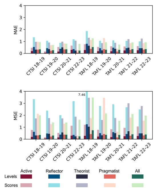 The MAE (top image) and MSE (bottom image) obtained between the scores and levels achieved by students before applying the filter and after filtering. The error obtained for each individual learning style is shown, as well as the error obtained for the overall learning styles.
