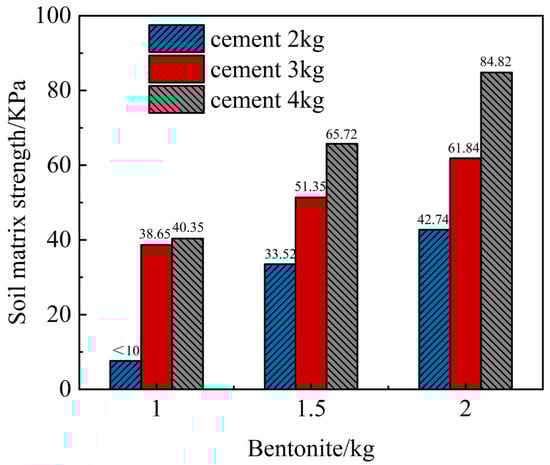 The results indicated that as water content increased, the matrix strength of the bentonite–cement pastes initially rose and subsequently declined, which suggested the existence of an optimal water content that maximized matrix strength. This phenomenon could be attributed to two factors: when the water content was too low, the cement paste was inadequately hydrated, resulting in the insufficient cementation of the soil; when the water content was too high, the strength of the cement paste decreased, weakening the soil’s cementing effect. With the increase in bentonite dosage, the matrix strength of the bentonite–cement pastes showed a tendency of first increasing and then decreasing, thus indicating the presence of an optimal bentonite dosage for maximizing matrix strength.