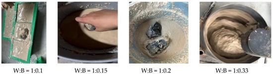 The effects of different water-to-bentonite (W/B) ratios on the fluidity and stability of the matrix are depicted in Figure 3. A W/B ratio of 1:0.1 required the matrix to cure for five days before achieving a gel suitable for holding the rock blocks, which indicated that the fluidity of the matrix was too low for use. A W/B ratio of 1:0.15 resulted in excessive fluidity, as the matrix failed to adequately hold rock blocks even after one-day curing, which indicated that the stability of the matrix was too poor for use. At a W/B ratio of 1:0.2, the matrix exhibited excellent fluidity and stability after one-day curing, while rock blocks could be held efficiently, which indicated that the performance of the matrix at this W/B ratio was more suitable for testing. When the W/B ratio was 1:0.33, the matrix displayed extremely high viscosity during mixing, while rock blocks could be placed directly, which indicated that the matrix was very expansive but too viscous for use.