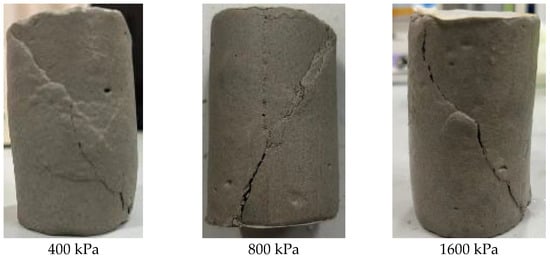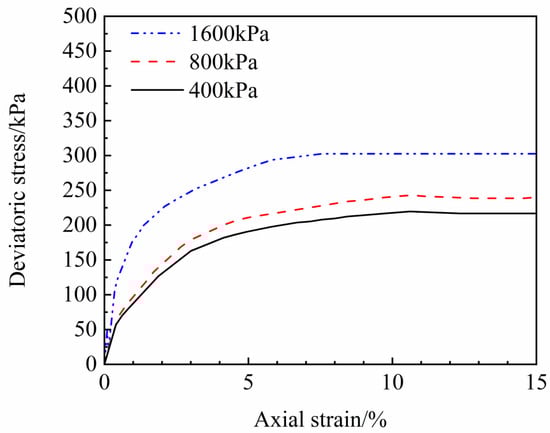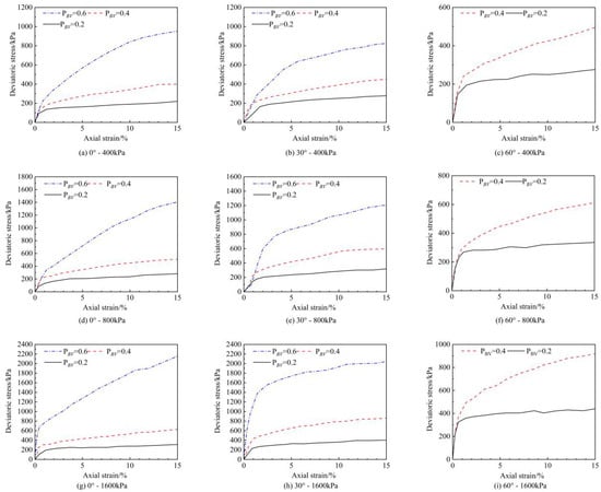 Figure 6 presents the stress–strain curves corresponding to various confining pressures at a PBV of 40%.