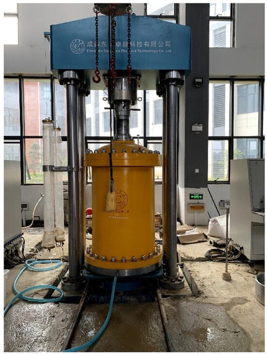 This study conducted large-scale triaxial compression tests using a matrix mixture with a mixing ratio of W:B:C = 1:0.2:0.4, which had been cured for one day. Prior to sample preparation, bentonite–cement pastes with different mixing ratios (see Figure 4) were extracted and subjected to conventional triaxial compression tests, as shown in Figure 5.