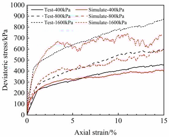 Simulated stress–strain curves of the cohesive SRM at a confining pressure of 400 kPa.