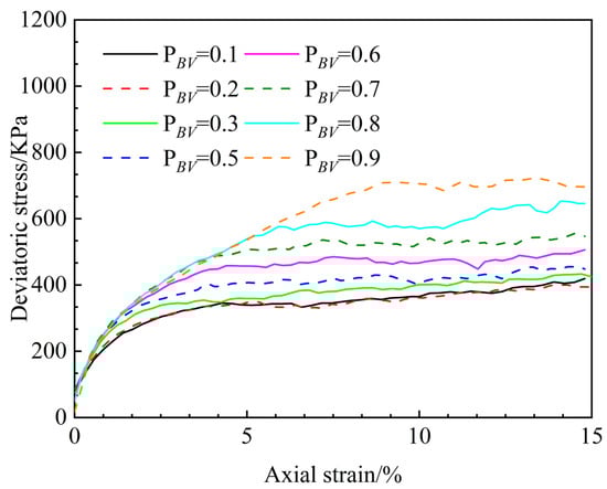 The cohesive SRM samples were subjected to a confining pressure of 400 kPa, and the shear strength versus axial strain curves for different PBV values were recorded, as illustrated in Figure 11.