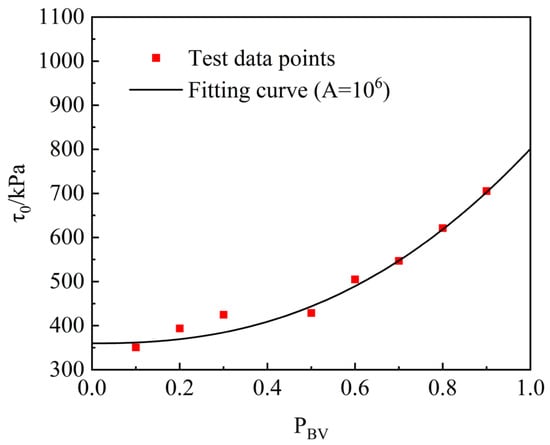 Based on the above analysis of the strength parameters of the cohesive SRM, the magnitude of the parameter A value in Equation (4) is further adjusted, and when A = 106, the relationship curve between PBV and shear strength is obtained as shown in Figure 14.