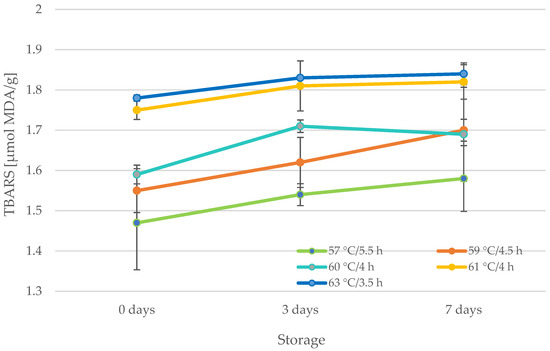 Oxidative changes in meat, determined shortly after heat treatment at day 0 and at days 3 and 7 during refrigerated storage, are presented in Figure 1. In general, the increasing tendency in TBARS values was noted with increasing heat treatment temperature, as well as extended time of storage. At day 0, samples cooked at 57 °C/5.5 h, 59 °C/4.5 h, and 60 °C/4 h showed significantly lower TBARS values (1.47–1.59 mg MDA/kg) than samples cooked at 61 °C/4 h and 63 °C/3.5 h (1.75–1.78 mg MDA/kg). At day 3, only sample cooked at the lowest temperature was characterised by the TBARS value significantly lower (1.54 mg MDA/kg) than samples cooked at 61 and 63 °C (1.81–1.83 mg MDA/kg) and the same tendency was observed after 7 days of storage (1.58 mg MDA/kg vs. 1.82–1.84 mg MDA/kg, resp.). The decline in TBARS value observed for 60 °C/4 h treatment after 7 days of storage may result from natural changes occurring in the meat during storage, such as oxidative processes, water loss, or interactions between different compounds present in meat. Malondialdehyde (MDA), which is one the secondary products of lipid oxidation and one of the main contributors to TBARS value [33], is highly reactive, and while, in general, its amount increases as a result of oxidation, it simultaneously reacts with other compounds present in meat, which makes it not detectable in TBARS assay [34]. Therefore, the TBARS values observed for stored meat products do not change in an unambiguous way but rather fluctuate [35], which presumably might have been the reason for the decrease observed in our study for the sample treated at 60 °C/4 h. Therefore, the highest TBARS values were recorded for samples heated at temperatures of 61 °C and 63 °C, which indicates more intense lipid oxidation at higher temperatures. It was shown that the TBARS values of samples were significantly influenced by treatment conditions (p < 0.001) and storage time (p < 0.01), but not by the interaction between them. A comparison of the TBARS value of raw meat (0.65 mg MDA/kg) and TBARS values of meat sous vide cooked and stored in refrigerated conditions (1.47–1.84 mg MDA/kg) suggests that heat treatment was the main contributor to the oxidative changes in meat products observed during short term storage in our study. Slight increases in TBARS values during storage of samples could be attributed to the presence of residual oxygen in the packages [36].