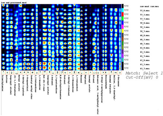 Only 16 volatile compounds were found in raw meat, while in meat heat-treated at temperatures of 57–63 °C, 29 compounds were identified (Figure 2). Peak intensity for 3-methyl-1-pentene, 2-propanethiol, isobutyl methyl ether, 2,3-butanedione, but-2-enal, 1-butanol, pentanal, 3-methyl-2-buthenal, 1,3-butanediol, heptanal, 2-ethyl-6-methylpyrazine, and 2-decanone increased with increasing thermal treatment temperature. Pentanal, hexanal, heptanal, and octanal are linear aldehydes, which were the dominant volatile aldehydes generated in cooked pork. These compounds were formed as a result of lipid oxidation that occurred during meat cooking and storage, as demonstrated by TBARS analysis (Table 1). A significant increase in pentanal, hexanal, heptanal, octanal, and nonanal, in sous vide-cooked lamb loin compared to raw meat was reported by Roldan et al. [40]. Hexanal and heptanal are derived mainly from linoleic and arachidonic acid oxidation, whereas octanal is generated as a product of oleic acid oxidation [46]. These compounds are responsible for the grassy and fruity aromas of meat [68]. It was also suggested that hexanal is a more effective indicator of lipid oxidation in meat than other volatile compounds [32].