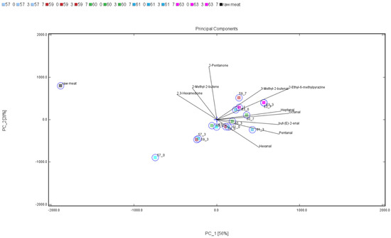 Principle component analysis (PCA) biplot of volatile components of pork loin.