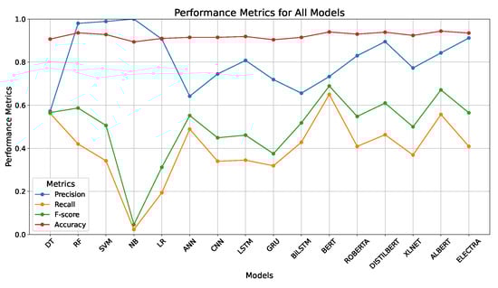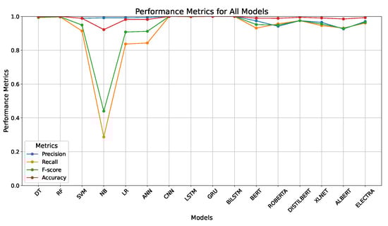 Overall, the enrichment of the dataset clearly elevates the performance metrics across all model categories, as shown in Figure 6. DL models, especially CNN, LSTM, GRU, and BiLSTM, reach optimal classification performance. Meanwhile, ML models such as Random Forest and Logistic Regression show considerable improvements, with Random Forest achieving perfect scores. Transformer models maintain their stronghold, with ALBERT, DISTILBERT, and BERT showcasing balanced and exceptional metrics, highlighting their robustness and suitability for complex tasks involving enriched data.