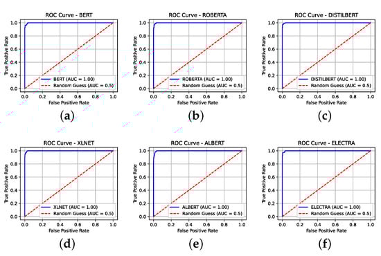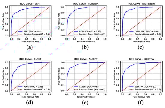 Performance evaluation of experimental Transformer models on the augmented dataset, presented via ROC curves for: (a) BERT, (b) ROBERTA, (c) DISTILBERT, (d) XLNET, (e) ALBERT, (f) ELECTRA.