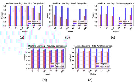 Performance comparison of experimental machine learning models on original and augmented datasets, evaluated using: (a) Precision, (b) Recall, (c) F1-Score, (d) Accuracy, (e) ROC AUC.