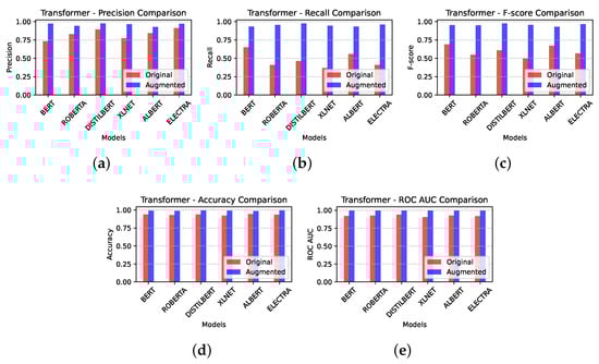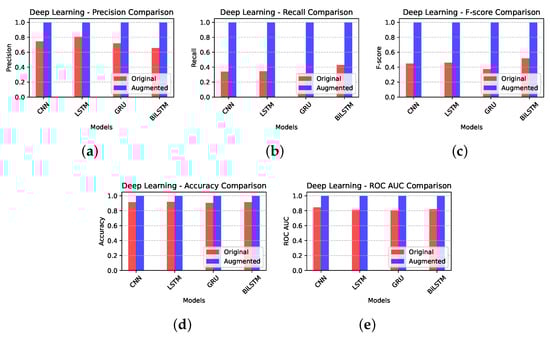 Performance comparison of experimental deep-learning models on original and augmented datasets, evaluated using: (a) Precision, (b) Recall, (c) F1-Score, (d) Accuracy, (e) ROC AUC.