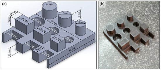 To conduct experimental studies, a special geometry of the reference component was developed to indicate differences in the technological quality of the shaped product caused by changes in the FFF process setpoints. Figure 1 shows a 3D CAD model of the component along with its dimensions. The geometry of the CAD model was developed with the following assumptions: