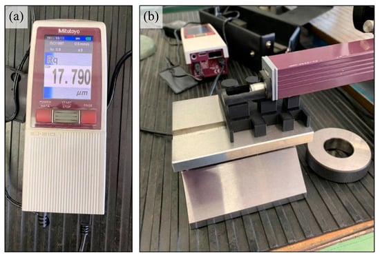 The SJ-210 stylus profilometer from Mitutoyo (Mitutoyo Corporation, Kawasaki, Japan) was used for surface roughness measurements. It is a portable system that allows measurement of surface roughness profiles for various types of products directly at the workstation. The measurement was carried out by means of a powered arm placed on an adjustable tripod. The radius of the measuring tip was 2.0 µm. The device allows measurement according to many standards, including DIN, ISO, ANSI, and JIS, and the determination of a wide set of roughness parameters [35]. A view of the device during measurement is presented in Figure 3.