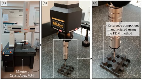 Measurement of the dimensional and shape accuracy of the manufactured parts was realized using a CrystaApex V544 coordinate measuring machine (CMM) from Mitutoyo (Mitutoyo Corporation, Kawasaki, Japan). This system allows measurements in the range of 500 × 400 × 400 mm, using interchangeable measuring probes. The measurement resolution of the CMM is 0.0001 mm, which makes the obtained measurement results very precise. The manufacturer’s software designed for the CMM allows the measurements to be programmed, making it possible to automate the measurement process in industrial or laboratory conditions [36]. Figure 4 shows the CMM during measurement.