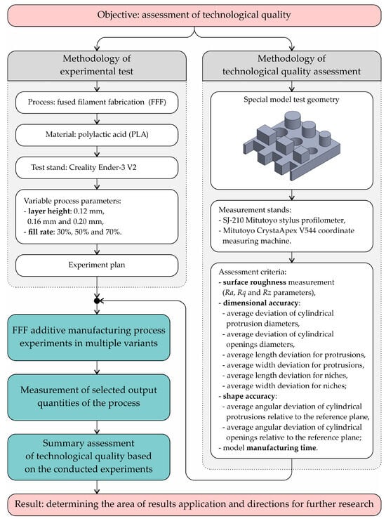 This paper describes the author’s methodology for studying the influence of the FFF additive manufacturing process parameters on the technological quality of shaped models. As a result, the influence of layer thickness and fill rate on the surface roughness as well as dimensional and shape accuracy of the manufactured models was determined. The analysis of the state of the art made it possible to identify the main limitations of manufacturing by additive methods and then enabled the development of the original research methodology adapted to the assessment of the technological quality of products shaped using the FFF method. For this purpose, a test model (reference component) with a special geometry was developed and fabricated, enabling the measurement of typical geometric features of products. The following conclusions were drawn from the verification tests conducted.