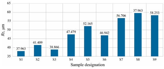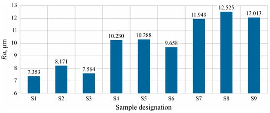 Due to the layered nature of model formation in the FFF additive manufacturing process, the roughness parameters were determined on the side surface of the reference component in the vertical direction (perpendicular to the layer system). The sidewall is obtained by extruding successive layers in the Z-axis, and its roughness is directly influenced by the height of the layer of the applied filament. Figure 6 shows the results of measuring the Ra parameter values for analyzed models.