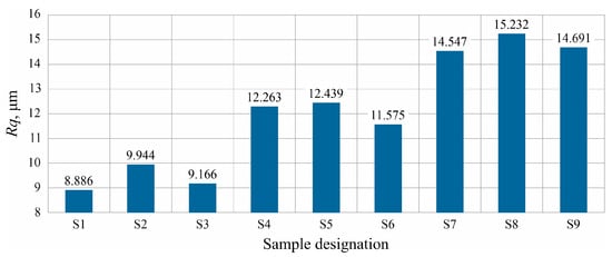 Figure 7 shows the results of measuring the values of the Rq parameter for individual models manufactured with varying FFF process parameters.