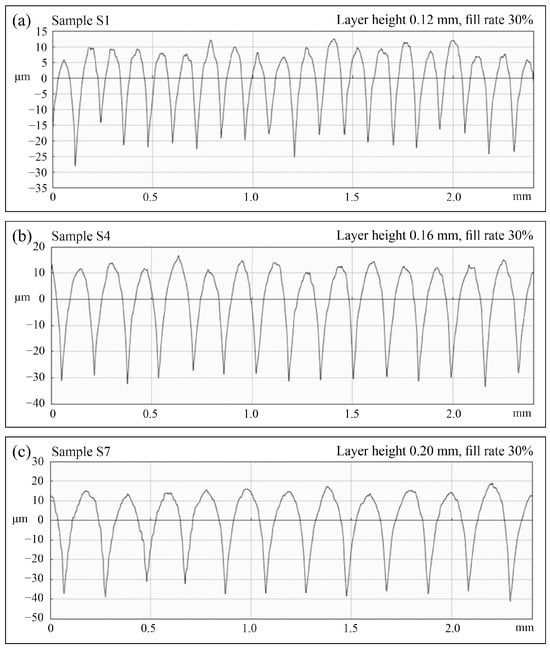 Side surface roughness profiles recorded by stylus profilometry for selected models produced with three different layer heights: (a) profile of sample S1, layer height 0.12 mm, fill rate 30%; (b) profile of sample S4, layer height 0.16 mm, fill rate 30%; (c) profile of sample S7, layer height 0.20 mm, fill rate 30%.