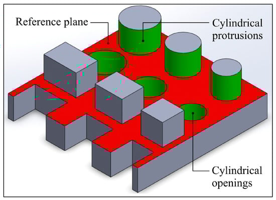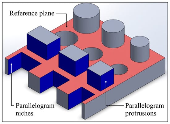 Figure 13 graphically presents another set of features measured as part of the assessment of the dimensional and shape accuracy of the reference component. The surface of the model, highlighted in red, was used to determine the reference plane in measuring the perpendicularity of the protrusions and niches walls (highlighted in blue in Figure 13). The walls of the perpendicular protrusions and niches were measured relative to each other to determine the deviation in length and width of these geometric features of the samples. The measurement, as in the case of cylindrical features, was completed by contact measurement at different heights of the walls, which made it possible to determine the distance between the planes of the protrusions and niches.