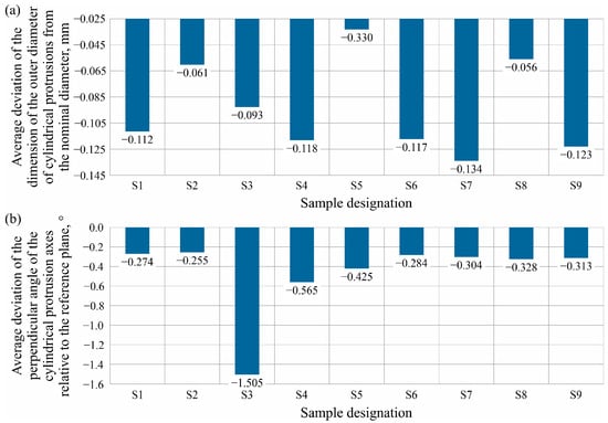 Charts showing the obtained measurement results: (a) average deviation of the outside diameter dimension of cylindrical protrusions from the nominal diameter; (b) average deviation of the perpendicular angle of the cylindrical protrusion axes relative to the reference plane.
