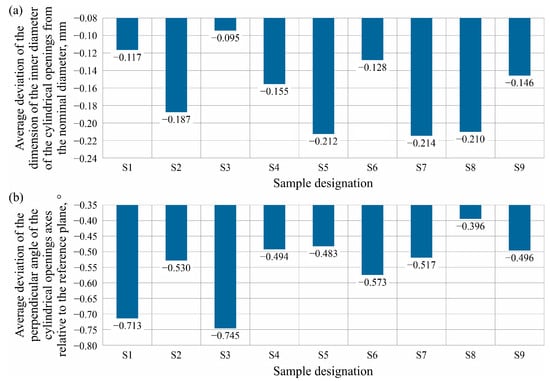 Charts showing the obtained measurement results: (a) average deviation of the dimension of the inner diameter of the cylindrical openings from the nominal diameter; (b) average deviation of the perpendicular angle of the cylindrical openings axes relative to the reference plane.