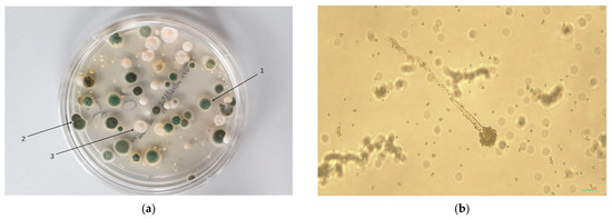The mycological examination. (a) The PDA plate with Penicillium (1), Aspergillus (2) and Alternaria (3) spp. Colonies. (b) The microscopic examination of morphological structures—conidial head of Aspergillus fumigatus (100× magnification).