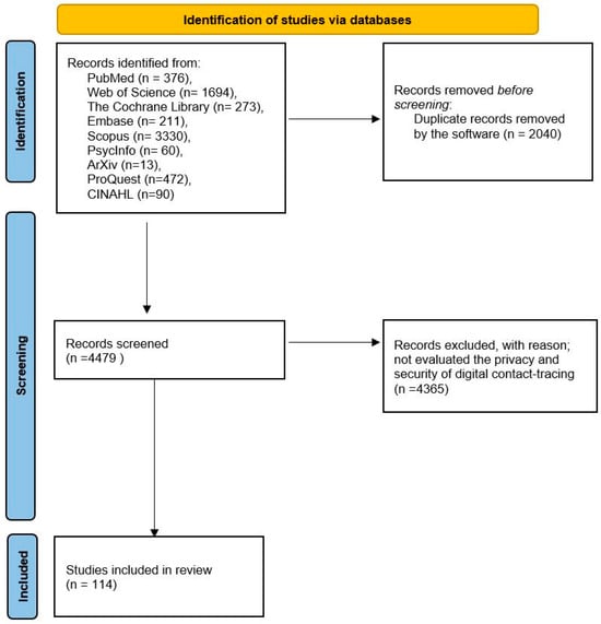 The search query included (‘COVID-19’ or ‘SARS-CoV-2’ or ‘corona virus’ or ‘coronavirus’ or ‘new coronavirus’ or ‘severe acute respiratory syndrome coronavirus’ or ‘2019-nCoV’) and (‘digital contact-tracing’ or ‘digital tracing’ or ‘digital tracking’ or ‘contact-tracing apps’) and (‘security’ or ‘acceptance’ or ‘psychology’ or ‘privacy’). During the second stage, duplicates were removed by the reference manager software and then screened based on titles and abstracts. During the final stage, individual manuscripts were screened, and those not meeting the inclusion criteria were excluded.