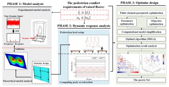 In light of the existing deficiency in quantitative analysis methods for assessing the comfort of walking on raised floors, this study has developed an index system to quantify pedestrian comfort on raised floors by synthesizing previous research findings and standards. The evaluation criteria focused on the natural frequency and peak acceleration of the most deformable point on the floor during walking. The pedestrian comfort of four distinct configurations of raised floors in a prefab bathroom unit was systematically analyzed. The natural frequency and mode distribution of the floor were determined through a combination of theoretical modal analysis and experimental modal analysis. Subsequently, the dynamic response of the floor was calculated utilizing walking loads as excitation. Furthermore, a raised floor size optimization design method, based on a multi-island genetic algorithm (MIGA), was introduced in this research. Correlation analysis was performed to investigate the impact of various components of the floor on pedestrian comfort. This innovative design method, without altering the material and structural components of the raised floor, achieved dual optimization of heat transfer performance and pedestrian comfort by adjusting parameters such as support foot spacing, beam shape and size, and support plate layer thickness. By merging simulation and experimentation, this study presented a highly efficient and cost-effective design method, enhancing the overall product performance of raised floors. Figure 1 illustrates the framework of the study.