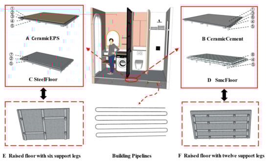 Models of four types of raised floor. (① Ceramic ② EPS ③ Waterproofed plate ④ Crossbeam ⑤ Support feet ⑥ Cement board ⑦ Stainless steel ⑧ SMC; The floor types A, B, and D are of support foot type E, while floor type C is of support foot type F).