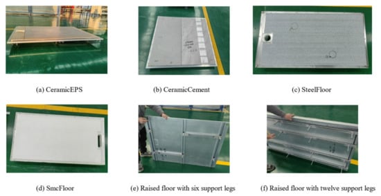 The research conducted in this study focused on four distinct types of raised floor systems manufactured by Beijing Livision Residential Industrial Technology Co., Ltd, located in Beijing, China. These included the hybrid ceramic–EPS composite raised floor, hybrid ceramic–cement board composite floor, stainless steel raised floor, and SMC raised floor. In Figure 2, detailed models of each of these raised floor systems are illustrated, while Figure 3 provides actual photographs for visual reference. These raised floor systems have been meticulously designed to cater to diverse market needs. In contrast to conventional raised flooring, the implementation of raised floors within prefab bathroom units necessitates a dual-functionality approach, fulfilling the dual roles of a waterproofed plate and elevated platform support. This integration demands an expansion in both the length and width dimensions to preserve a cohesive and seamless design aesthetic. Concurrently, the thickness of the flooring is suitably enhanced to effectively satisfy waterproofing requirements, thereby safeguarding against potential leaks.